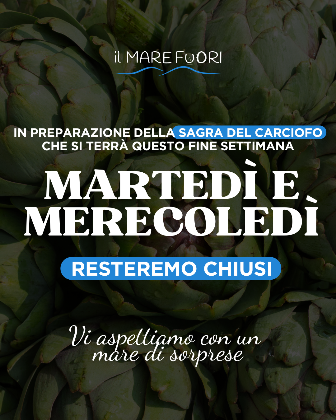 Posted in Eventi Chiusura speciale In preparazione della tanto attesa Sagra del Carciofo… ci prendiamo una piccola pausa! Martedì e Mercoledì saremo chiusi ma solo per tornare più carichi che mai Stiamo lavorando per regalarvi un’esperienza speciale! Ci rivediamo giovedì… pronti a farvi vivere un vero mare di emozioni On Aprile 6, 2026