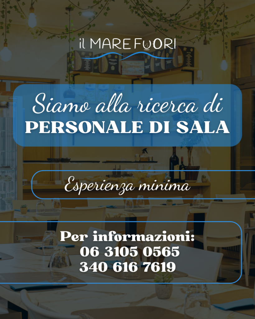 Posted in Eventi Siamo alla ricerca di personale Siamo pronti a crescere… e cerchiamo qualcuno che lo faccia insieme a noi Se hai passione per la ristorazione, sorriso e voglia di metterti in gioco, Il Mare Fuori è il posto giusto per te Contattaci ai numeri in locandina oppure passa a trovarci! 📍 Ti aspettiamo in Lungomare Marco Polo, 20 – Ladispoli 📞 06 3105 0565 On Marzo 17, 2026